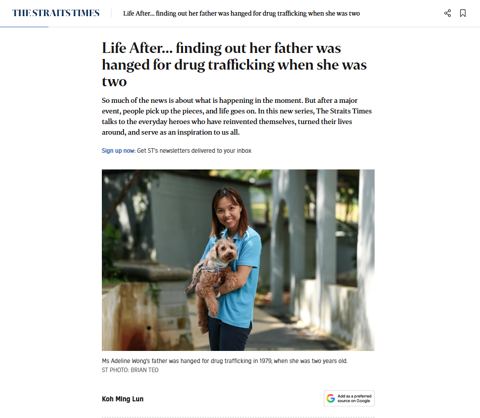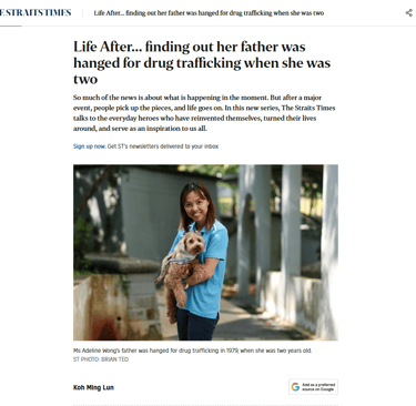 In the Straits Times article, Adeline Wong turned devastating and tragic news of her father that she never knew and made something positive out of it. Adeline Wong’s father was executed for drug trafficking in 1979 when she was 2 but she only found out about it much later at the age of 33. Instead of drowning in pity or questioning her heritage, she took his message of hope for her and began volunteering in Prison Fellowship Singapore, turned her own life around, and even started a social enterprise bringing animal therapies to prisoners and other beneficiaries. That’s really something!